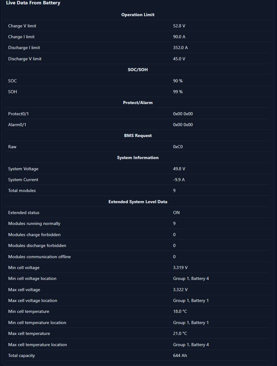 (SOC, SOH, limits, alarms, status) - Displays live battery and system data directly from the master battery