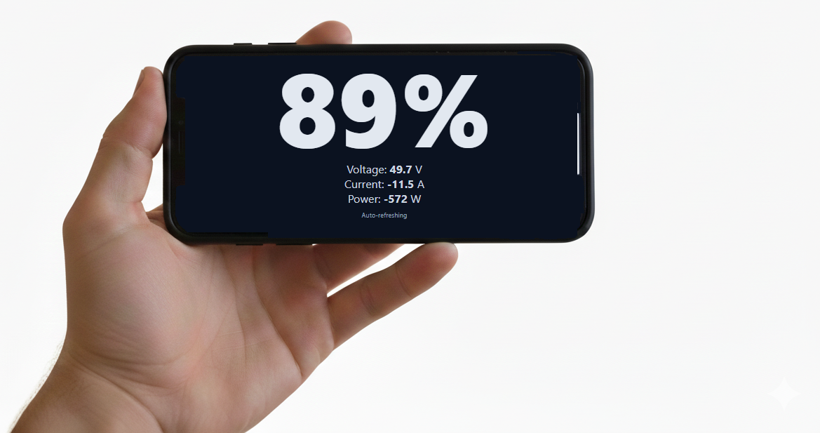 - Displays SOC, voltage, current, and power (V×I)